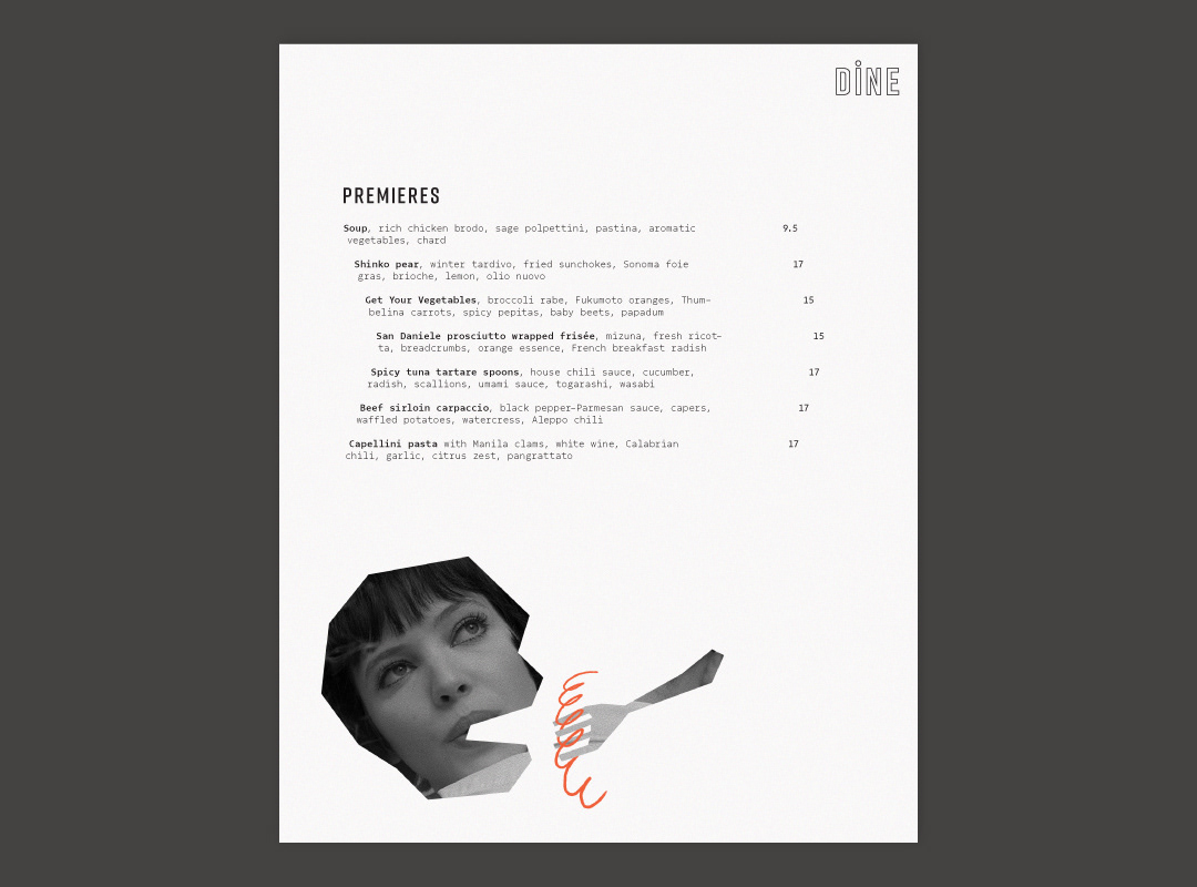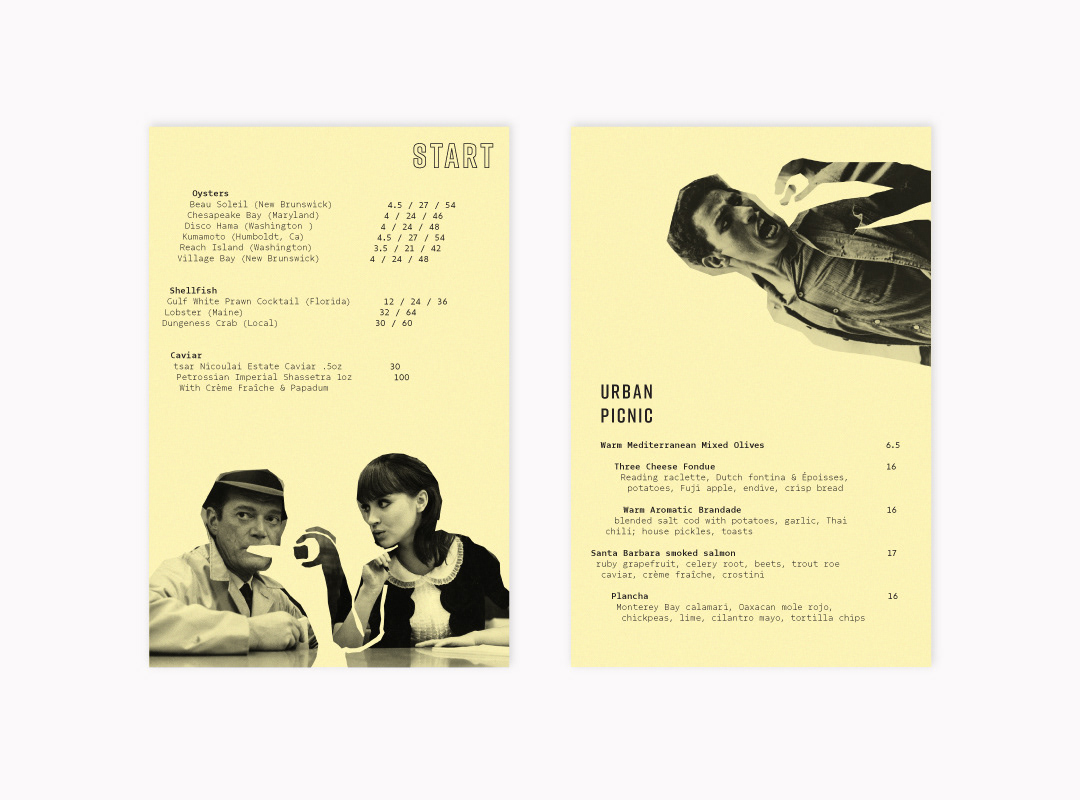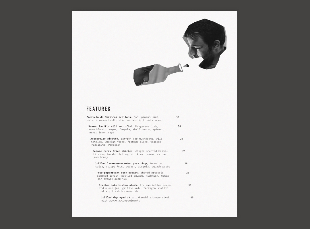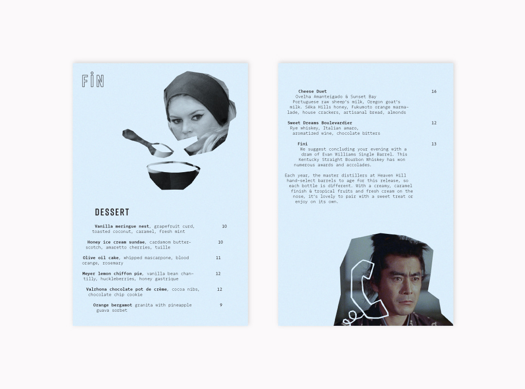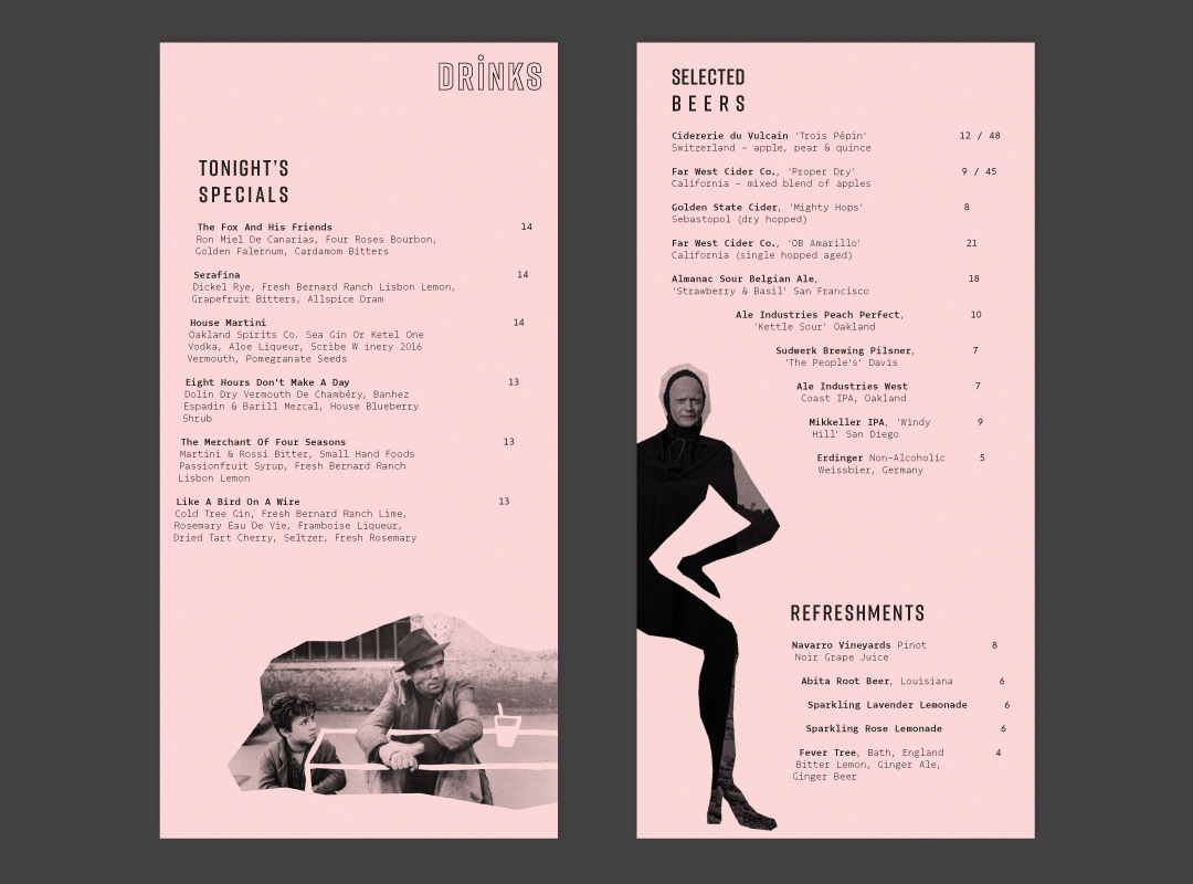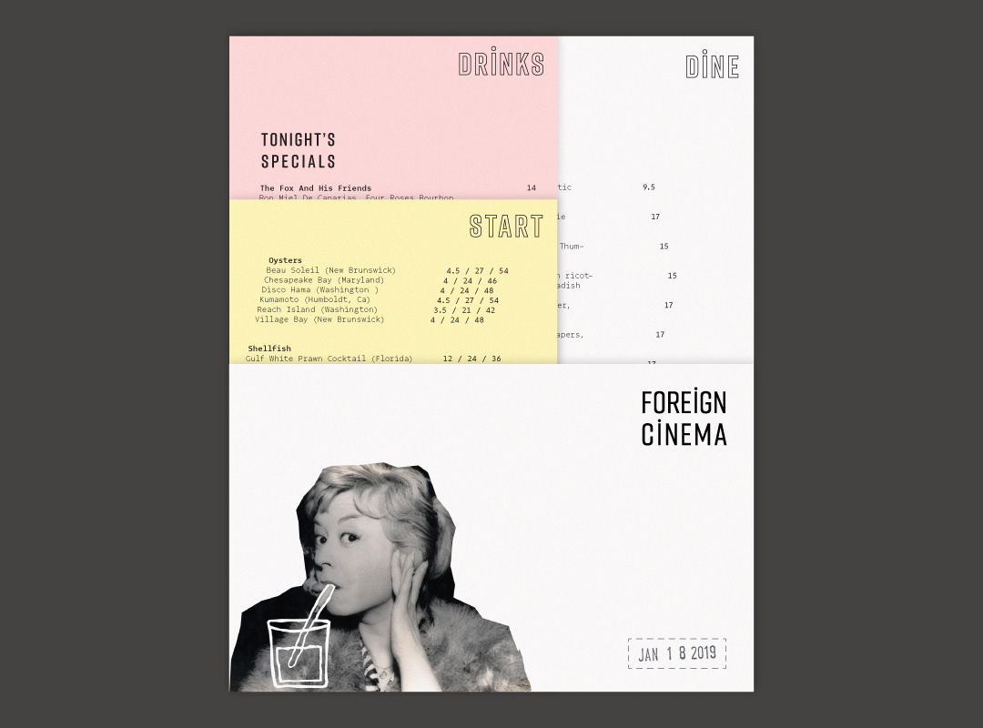 A redesign and menu project for the San Francisco restaurant “Foreign Cinema,” featuring experimental dishes and nightly film screenings on their patio.