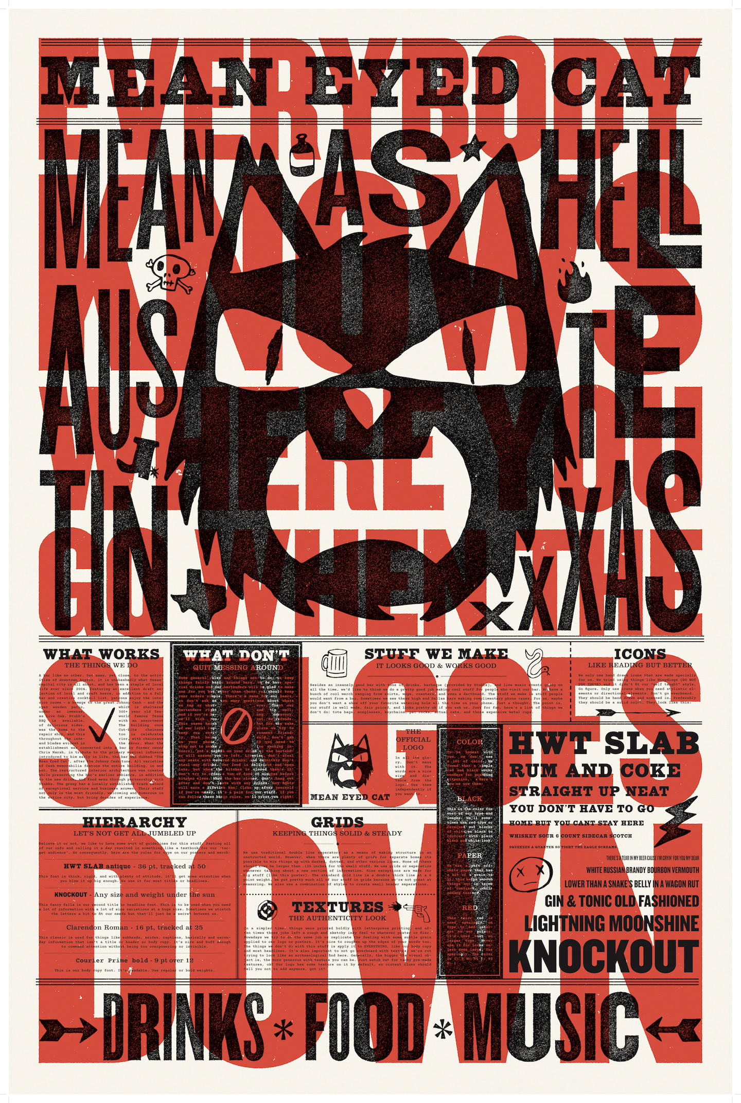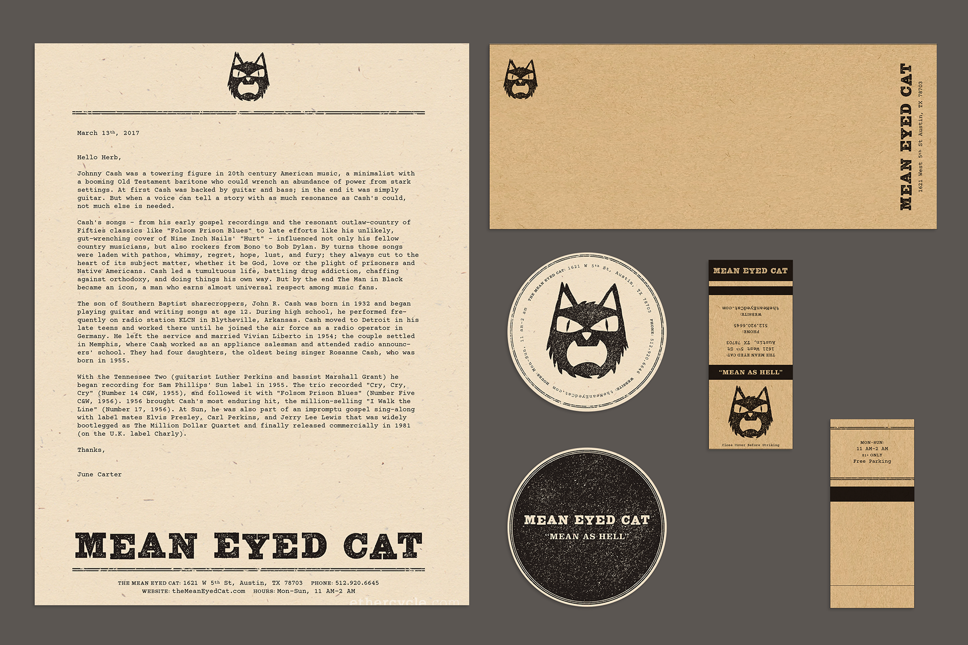 A rebrand and poster for the Mean Eyed Cat, a rough and rowdy gun barrel country dive bar in Austin, Texas. Yes, it’s weird there’s stationery for a bar.